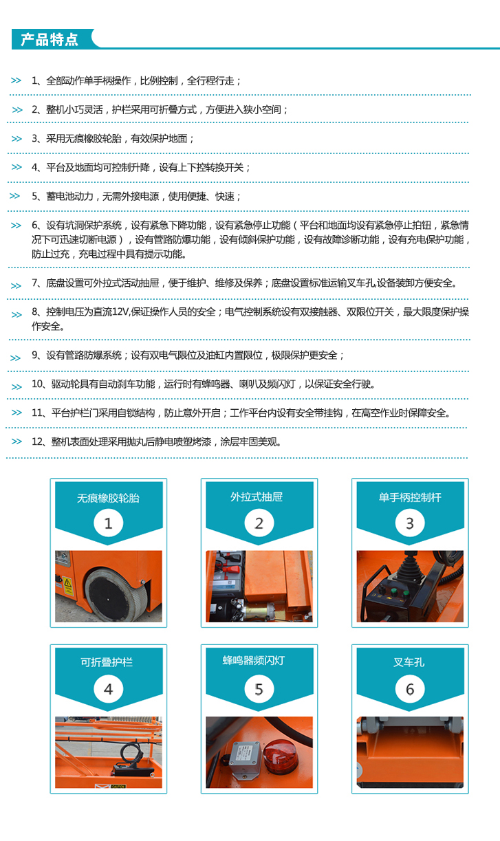 • 產(chǎn)品特點(diǎn):體積小、自重輕、移動(dòng)靈活,可通過狹小門洞或電梯,能在極小空間發(fā)揮最大作用。可代替?zhèn)鹘y(tǒng)梯子或腳手架,提高工作效率,保障操作人員安全,是高空作業(yè)的必備工具。