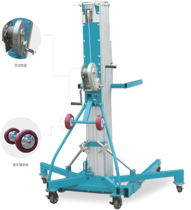 • 產品特點:備有雙速升降絞盤收藏時高度只有1.99m 非常精致輕巧,可進出一般通道,機背滑輪藏于機身背部有助于搬運上下貨車,方便運輸